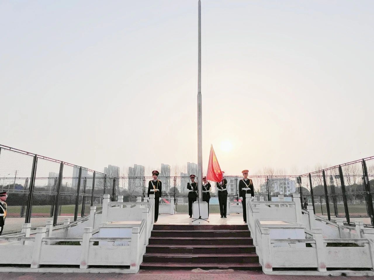 在嘹亮的國歌聲中,鮮艷的五星紅旗冉冉升起,全體師生齊唱國歌,行注目禮。