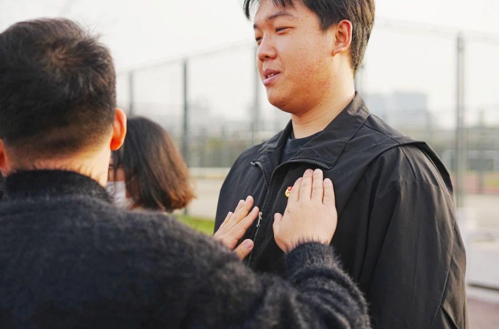 黨員教師為新團員佩戴團徽,以莊嚴(yán)儀式傳遞責(zé)任擔(dān)當(dāng)。一枚枚閃亮的團徽,承載著組織的期望,更點燃了青年學(xué)子砥礪奮進的青春熱情。、