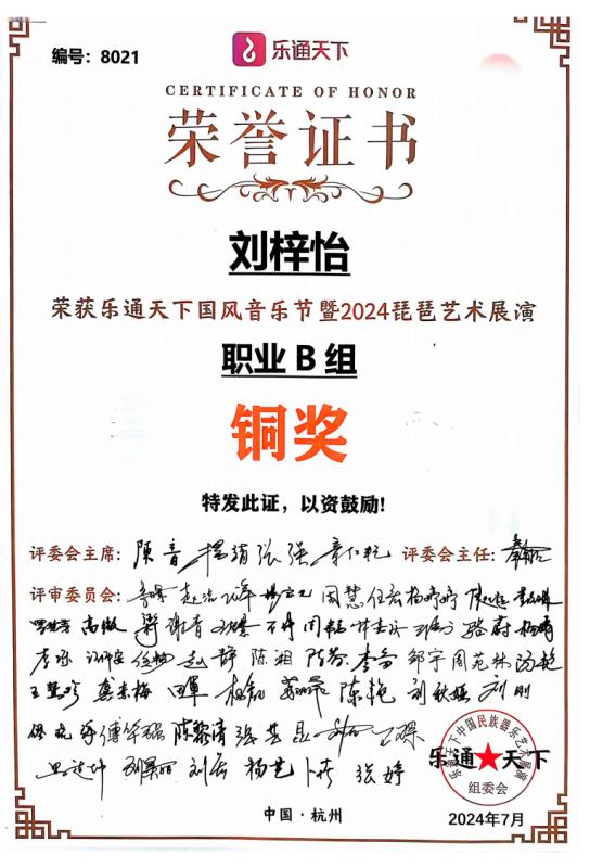 樂(lè)通天下國(guó)?音樂(lè)節(jié)暨2024 琵琶藝術(shù)展演由樂(lè)通天下中國(guó)器樂(lè)民族樂(lè)藝展演組委會(huì)主辦,十六省琵琶學(xué)會(huì)、琵琶專(zhuān)業(yè)委員會(huì)協(xié)辦。本次大賽于2024年7月在杭州舉辦,活動(dòng)秉承“弘揚(yáng)中華優(yōu)秀傳統(tǒng)音樂(lè)文化,傳承發(fā)展中國(guó)琵琶藝術(shù)”宗旨,超百位中國(guó)琵琶名家共同參與評(píng)選。劉梓怡同學(xué)在比賽中一路過(guò)關(guān)斬將,憑借優(yōu)異的表現(xiàn)取得銅獎(jiǎng)。