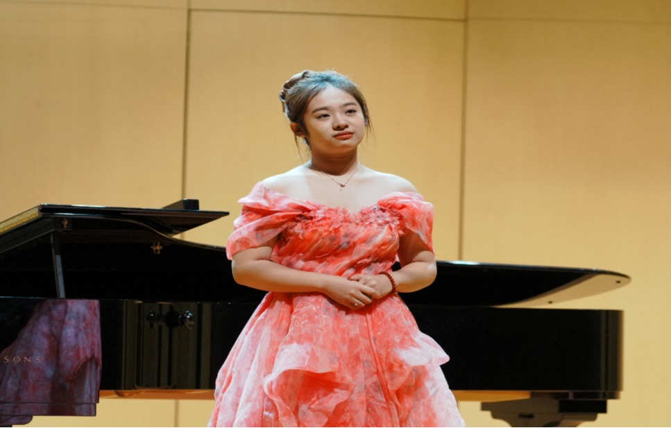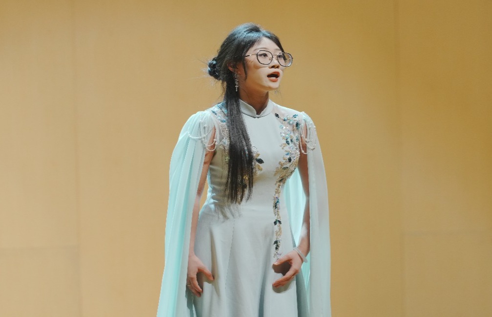 音樂會在深情婉轉(zhuǎn)的《我的愛人你可聽見》中拉開帷幕。該曲作為歌劇《長征》的經(jīng)典選段,學(xué)子以細(xì)膩的情感處理與扎實的氣息控制,將革命年代夫妻間的思念與牽掛娓娓道來。演唱中,學(xué)子精準(zhǔn)把握旋律的起伏變化,在“待到云開見日時”的高潮段落,以飽滿而不張揚的音色傳遞熾熱情感,尾句“笑看大地?fù)Q人間”的氣聲收尾余韻悠長,瞬間將觀眾帶入那段烽火連天卻情深意重的歲月,贏得全場熱烈掌聲。