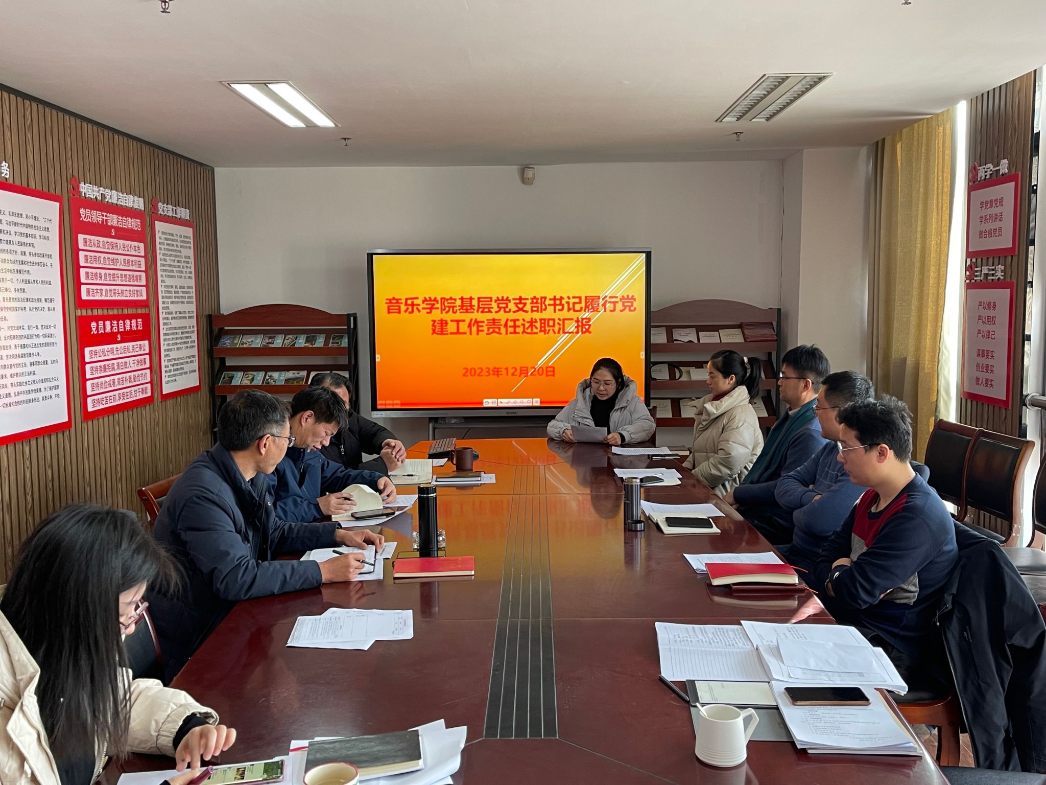 12月20日,音樂學(xué)院在戰(zhàn)旗黨建工作室召開了基層黨支部書記黨建工作責(zé)任述職匯報會。本次會議旨在總結(jié)過去一年各黨支部在黨建工作中的成效與經(jīng)驗,明確未來工作方向,進(jìn)一步發(fā)揮黨組織在學(xué)院發(fā)展中的戰(zhàn)斗堡壘作用。會上,教工第一黨支部書記馬驍、教工第二黨支部書記王文哲以及師生聯(lián)合黨支部書記高慧分別進(jìn)行了述職匯報。