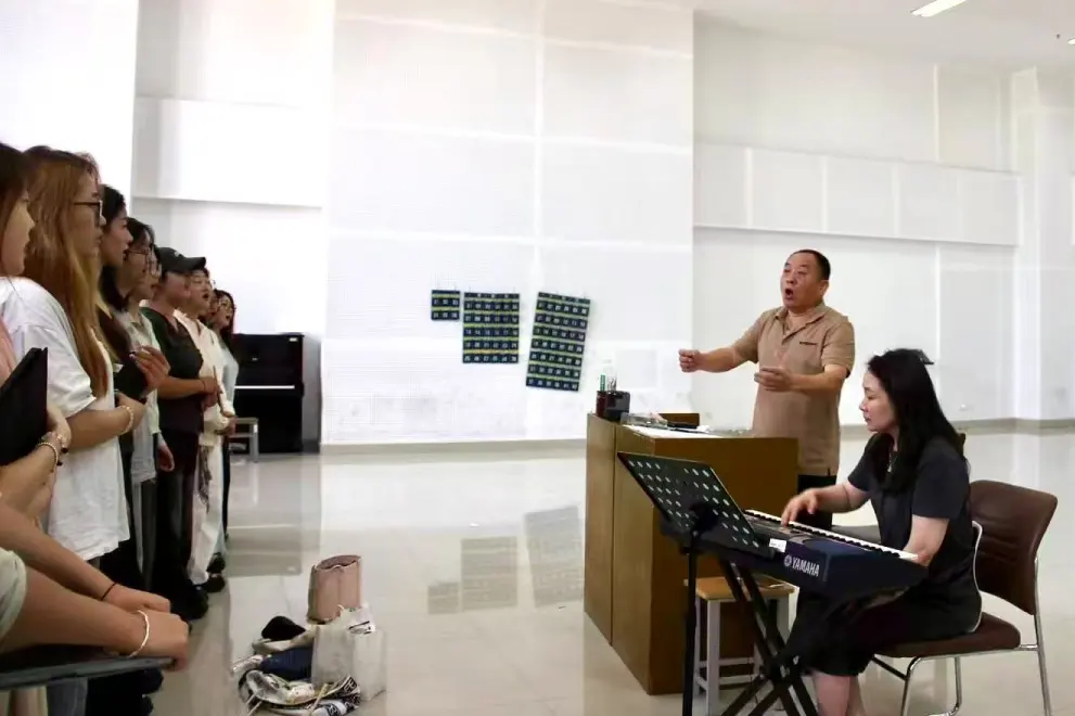 這份沉甸甸的榮譽(yù),凝結(jié)了音樂學(xué)院師生為期兩個(gè)月的辛勤汗水與團(tuán)結(jié)拼搏。為備戰(zhàn)此次大賽,音樂學(xué)院關(guān)工委主任伍兵老師和仲崇連老師牽頭組隊(duì),音樂學(xué)院關(guān)工委常務(wù)副主任張律教授擔(dān)任銀鯊合唱團(tuán)藝術(shù)總監(jiān),關(guān)工委委員顧永博擔(dān)任指揮,王文哲、姜東文、梁宏亮三位委員擔(dān)任伴奏,放棄暑期休息時(shí)間,克服種種困難,帶領(lǐng)學(xué)院師生全身心投入集訓(xùn)。張律教授嚴(yán)謹(jǐn)?shù)慕虒W(xué)態(tài)度感染了集訓(xùn)師生,師生團(tuán)隊(duì)同心協(xié)力,將備賽過程作為錘煉專業(yè)、凝聚人心的實(shí)踐課堂。作為音樂學(xué)院關(guān)工委“樂齡護(hù)航 藝路同行”品牌活動(dòng)之一,本次合唱比賽從備賽到?jīng)Q賽,關(guān)工委老同志始終以高度的責(zé)任感和飽滿的熱情全程參與,用豐富的藝術(shù)經(jīng)驗(yàn)和育人情懷為團(tuán)隊(duì)保駕護(hù)航。在暑期集訓(xùn)期間,面對(duì)高溫天氣和緊張的備賽節(jié)奏,老同志們不僅毫無怨言,還主動(dòng)為學(xué)生們答疑解惑,從發(fā)聲技巧、情感表達(dá)再到舞臺(tái)臺(tái)風(fēng),逐一進(jìn)行細(xì)致指導(dǎo)。張律教授常常犧牲個(gè)人休息時(shí)間,反復(fù)打磨合唱作品的細(xì)節(jié),針對(duì)不同聲部的特點(diǎn)制定個(gè)性化訓(xùn)練方案,幫助學(xué)生們突破技術(shù)瓶頸;除了專業(yè)指導(dǎo),關(guān)工委同志還十分關(guān)心學(xué)生們的生活與心理狀態(tài)。得知部分學(xué)生因長(zhǎng)時(shí)間集訓(xùn)產(chǎn)生疲憊情緒,伍兵老師和仲崇連老師主動(dòng)與學(xué)生談心交流,用自身的奮斗經(jīng)歷鼓勵(lì)大家堅(jiān)持夢(mèng)想、克服困難,讓學(xué)生們?cè)诟惺艿疥P(guān)懷與溫暖的同時(shí),重新激發(fā)了訓(xùn)練熱情。在老同志們的引領(lǐng)下,整個(gè)合唱團(tuán)隊(duì)形成了互幫互助、積極向上的良好氛圍,學(xué)生們不僅在專業(yè)能力上得到了顯著提升,更在團(tuán)隊(duì)協(xié)作和意志品質(zhì)方面收獲了寶貴的成長(zhǎng)。
