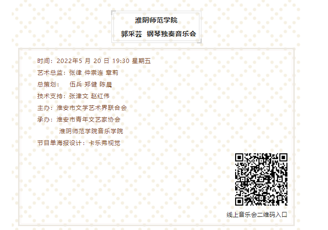 5月20日,由淮安市文學(xué)藝術(shù)界聯(lián)合會主辦,淮安市青年文藝家協(xié)會承辦的“幸福淮安 文藝惠民”——郭采蕓老師獨奏鋼琴音樂會成功舉辦。音樂會由音樂學(xué)院關(guān)工委主任伍兵教授擔(dān)任總策劃、常務(wù)副主任張律教授擔(dān)任藝術(shù)總監(jiān)。