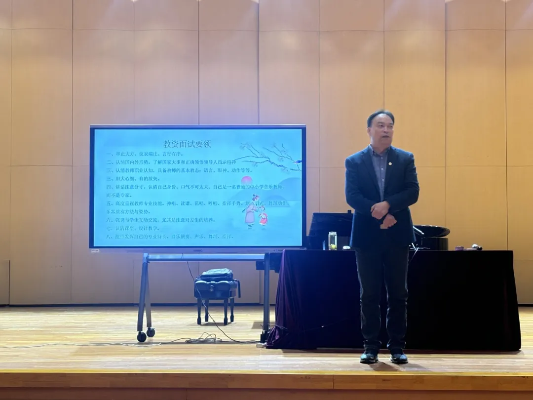 講座現(xiàn)場,毛教授圍繞音樂教資面試與考編的核心要點展開,從儀態(tài)儀表、職業(yè)認知到專業(yè)技能展示,逐一拆解應試技巧。首先要舉止大方、儀表端莊且言行有序,具備教師基本教態(tài),如恰當的語言、眼神與動作。同時,要認清國內外形勢,了解國家大事與領導指示精神,明確教師職業(yè)認知,講話注意分寸,牢記自己是普通中小學音樂教師而非專家。還需高度重視彈唱、讀譜、范唱、指揮手勢、劃拍圖式、舞蹈動作及樂器演奏等專業(yè)技能,注重與學生互動交流,尤其關注差生培養(yǎng),認清課程并設計教學,充分發(fā)揮自身在器樂演奏、聲樂、舞蹈、指揮等方面的專業(yè)特長,如此方能在教資面試中展現(xiàn)風采。