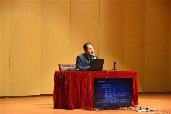 史老師從一個目標(biāo)、兩支隊伍、三位一體、四個維度、五大抓手、六大品牌等六個方面簡單介紹學(xué)生工作。他說,班級的定義是學(xué)生生活成長的地方并且提倡國家立德樹人的教育方針。緊接著史老師播放了一個優(yōu)秀班級文化建設(shè)的視頻,向同學(xué)們展現(xiàn)出班集體對孩子的影響力。史老師說,身為教師除了教書育人,還要做好班集體建設(shè)。不同的班級氛圍對孩子的影響不同,對孩子未來的發(fā)展有著潛移默化的影響。他還提醒同學(xué)們在創(chuàng)建班級建設(shè)的同時要注意有積極的社團活動和實踐活動。在說到班級崗位建設(shè)三個原則時,史老師著重強調(diào)每個班級崗位都要落實到每個學(xué)生。最后,史老師就班隊會的選題給同學(xué)們做出總結(jié)。